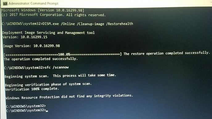 • 完成后,运行 sfc /scannow 命令扫描系统以查找丢失的损坏系统文件。如果找到,sfc 实用程序会自动从位于 %WinDir%\System32\dllcache 的压缩文件夹中使用正确的恢复它们。