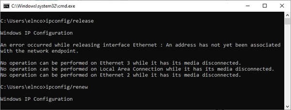 但是,您将在使用 ipconfig/renew 命令后立即重新联机。您的电脑将从路由器等 DHCP 服务器请求一个新的 IP 地址。