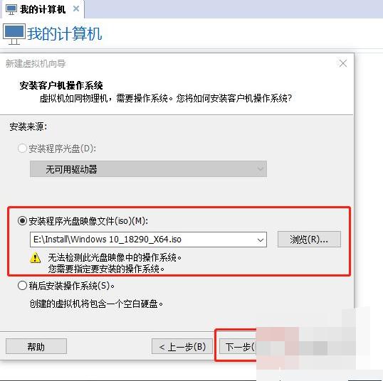 3、选择【Installer disc image file (iso)】(安装程序光盘映像文件(iso)),点击【浏览】按钮,选择我们下载的win10的iso安装文件,然后点击下一步(如果提示“无法检测到此光盘镜像中的操作系统”,可以忽略这个提示,只要你的安装文件正常,直接点击下一步即可,如果没有win10镜像,点击下方链接下载)