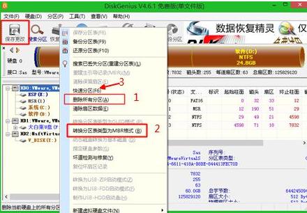 3、进入pe系统后,双击【DG分区工具】,右键选择硬盘,先【删除分区】,保存修改,再【将分区表类型转换为MBR格式】,保存变化,最后是【Quick Partition】