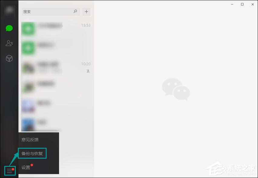 2、打开微信PC版程序后,点击左下角的“设置”按钮,在其扩展面板中找到“备份与恢复”项,点击打开。