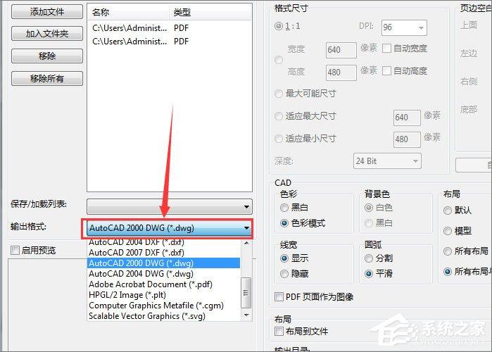3、接下来在“输出格式”下拉列表中选择对应版本的DWG格式文件。