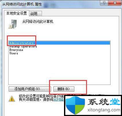 6. 在“从网络访问此电脑属性”对话框中,在“本地安全设置”的窗格中,删除除“所有人”以外的所有帐户。