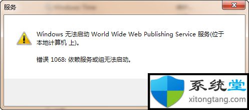 win7系统使用久了,很多网友反映win7系统提示依赖服务或组无法启动的问题,非常不方便。有什么办法可以永久解决Win7系统提示依赖服务或组无法启动的问题... IIS,Internet Information Service,是微软提供的基于Microsoft Windows的基础Internet服务。ISS 站点是在其中创建的,但似乎并不那么顺利。Win7系统下,用户在新建IIS站点时提示Windows无法启动万维网发布服务(位于本地电脑上)。错误 1068:依赖服务或组无法启动。如何解决这种情况?