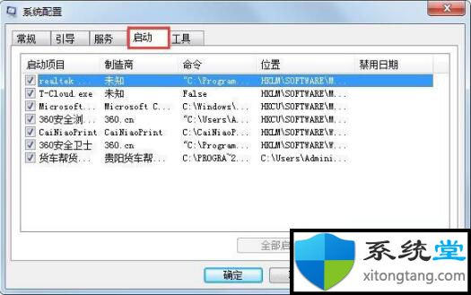 7.单击“启动”选项卡,然后单击“全部禁用”并确定;如图所示: